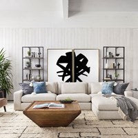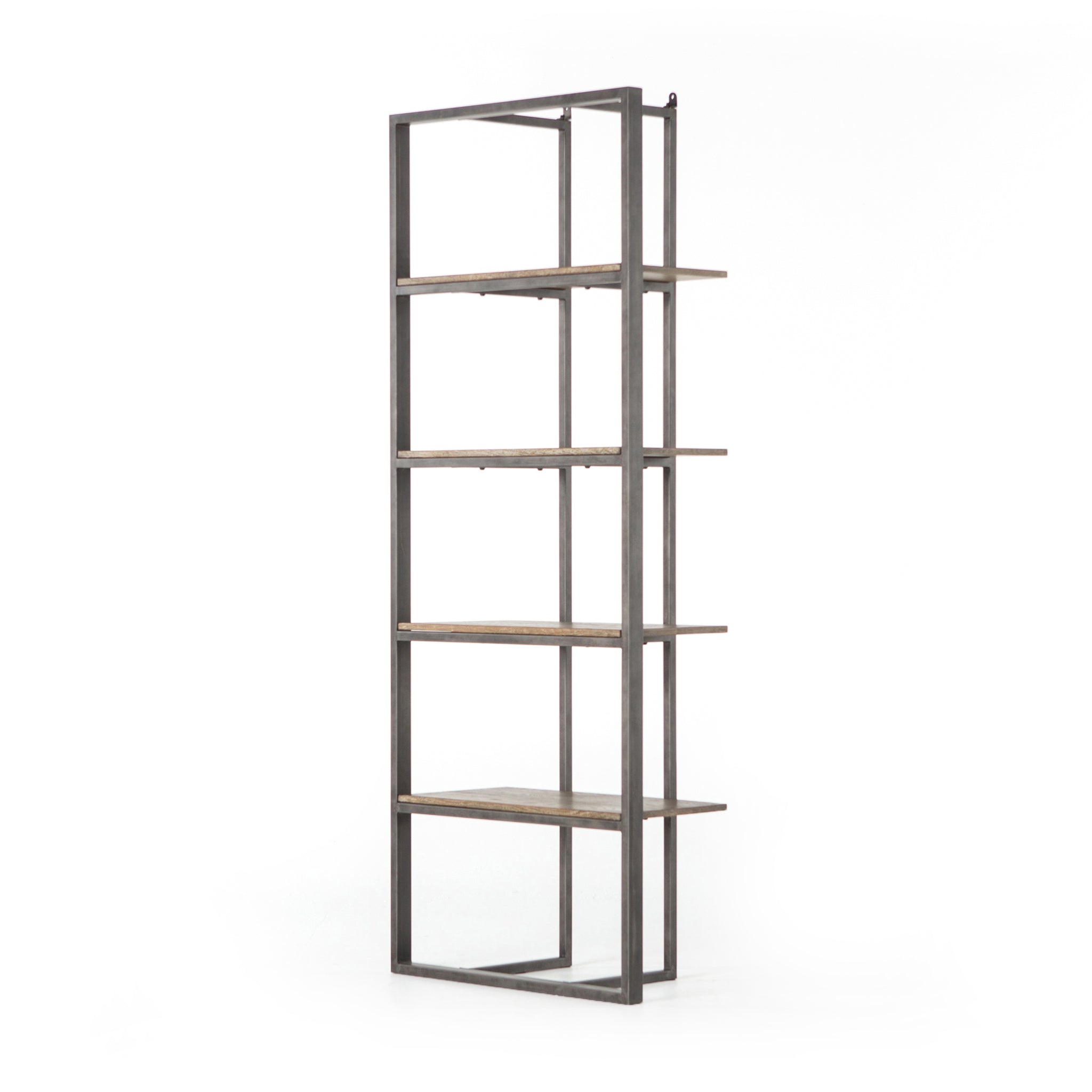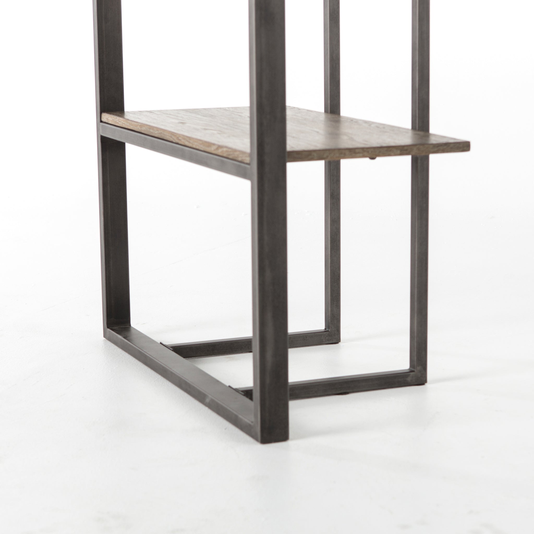 Storage with an industrial mix. Square stock iron stunningly frames and wraps wooden shelves finished in dark, burnt oak veneer.